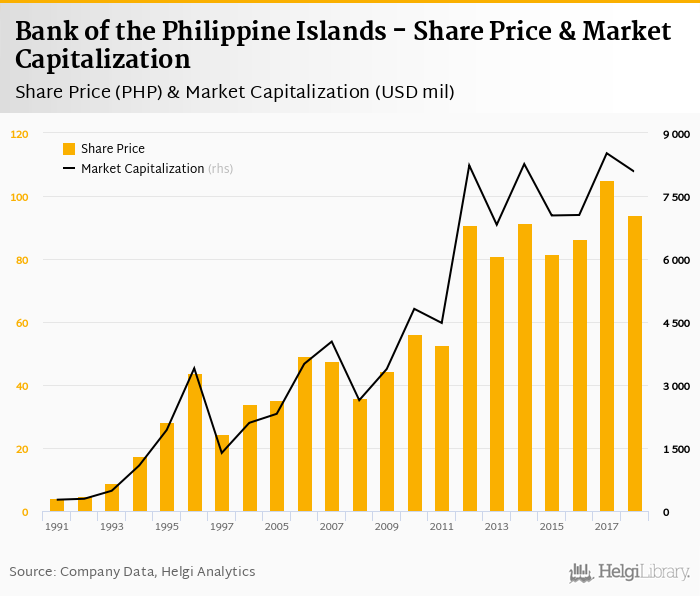 Bank of the Philippine Islands stock traded at PHP 94.0 per share at the end of 2018 implying a market capitalization of USD 8,081 mil.