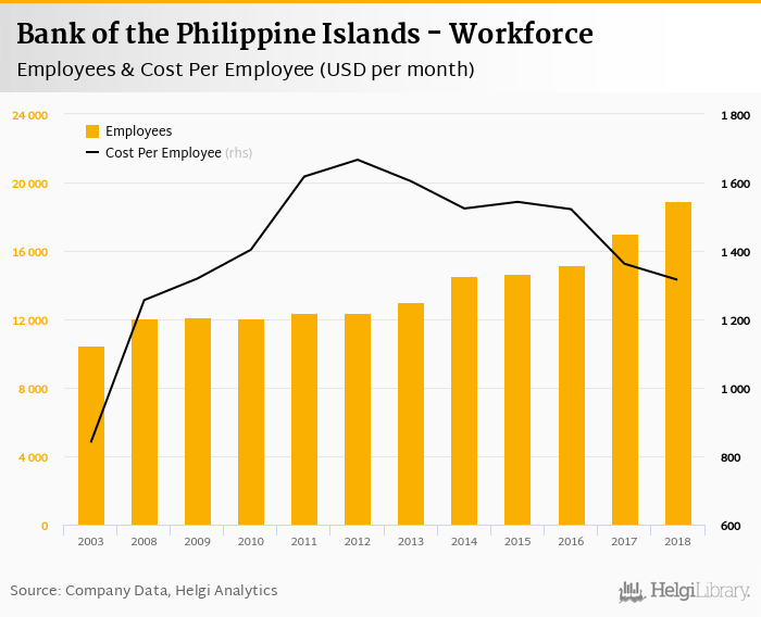 Bank of the Philippine Islands employed 18,909 persons in 2018, up 10.9% when compared to the previous year. Historically, the bank's workforce hit an all time high of 18,909 persons in 2018 and an all time low of 10,478 in 2003.