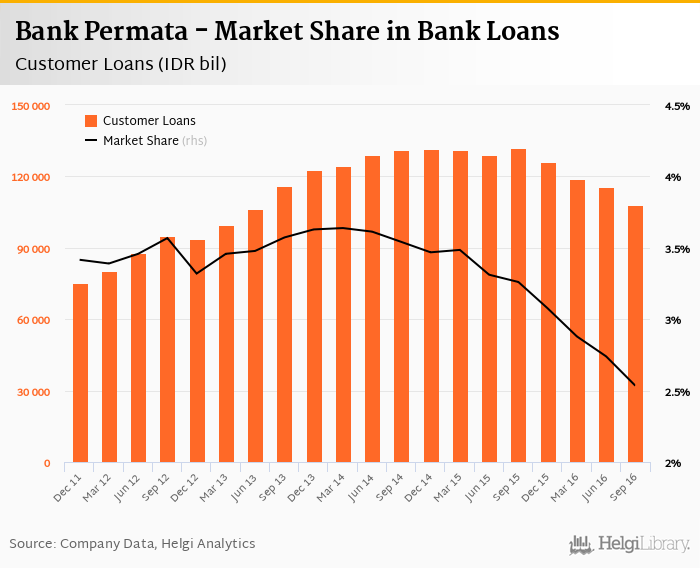 Bank Permata's customer loans reached IDR 108,108 bil in 2016-09-30, down 6.27% compared to the previous year.