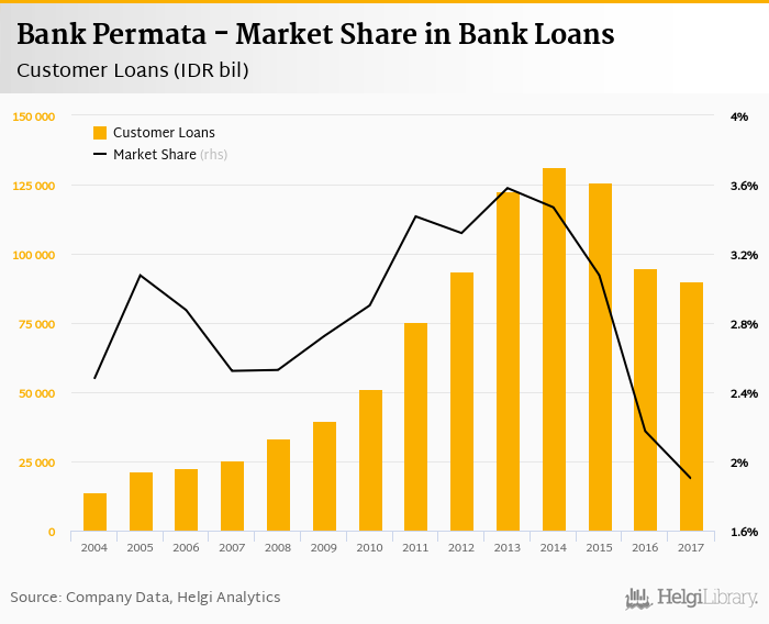Bank Permata accounted for 1.90% of all customer loans issued in Indonesia at the end of 2017. Historically, the bank’s market share in customer loans reached an all time high of 3.58% in 2013 and an all time low of 1.90% in 2017.