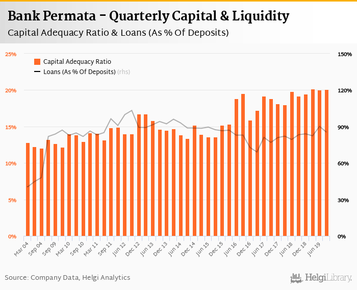 Bank Permata's capital adequacy ratio reached 20.1% at the end of third quarter of 2019, up from 20.1% when compared to the previous quarter. Historically, the bank’s capital ratio hit an all time high of 20.2% in 1Q2019 and an all time low of 12.0% in 3Q2004.