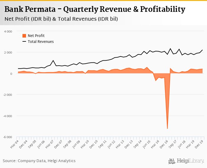 Bank Permata made a net profit of IDR 408 bil under revenues of IDR 2,225 bil in the fourth quarter of 2019, up 0.167% and 17.7% respectively when compared to the same period last year.