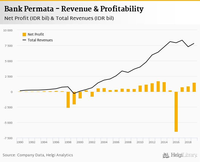 Bank Permata made a net profit of IDR 1,500 bil under revenues of IDR 7,832 bil in 2019, up 66.7% and 7.66% respectively compared to the previous year.