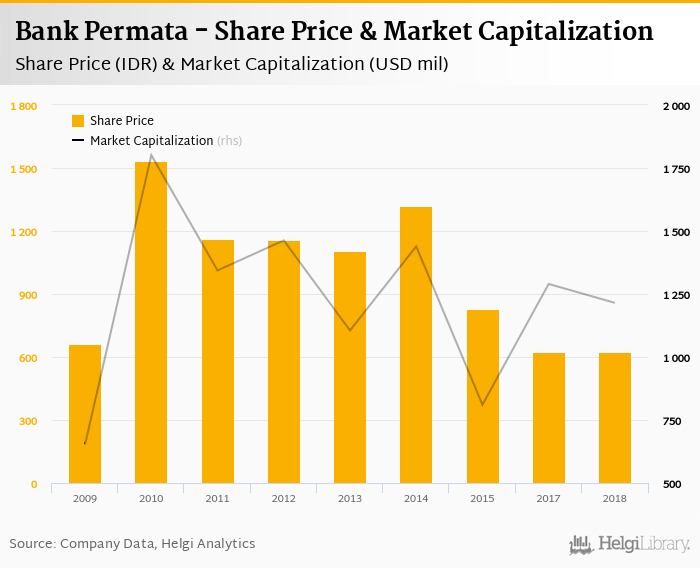 Bank Permata stock traded at IDR 625 per share at the end of 2018 implying a market capitalization of USD 1,215 mil.