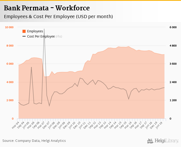 Bank Permata employed 7,010 persons in 2019-09-30, up 0.157% when compared to the previous year. Historically, the bank's workforce hit an all time high of 7,892 persons in 2015-12-31 and an all time low of 4,568 in 2007-03-31.