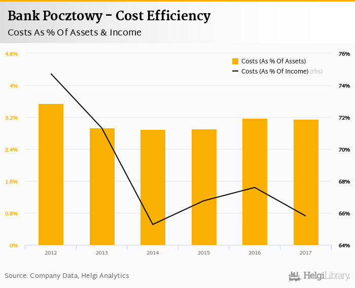 Comparing Bank Pocztowy with its closest peers, PKO BP operated in 2017 with a cost to income ratio of 48.0% in 2017, and Alior Bank reached 49.7%.
