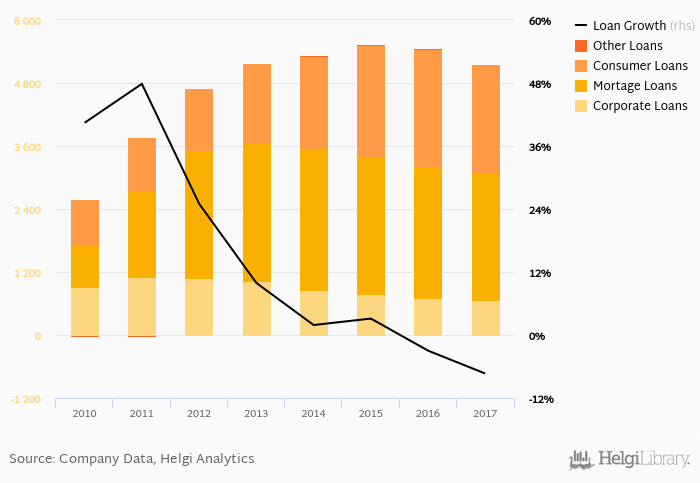Mortgage loans represented 47.2% of the bank's loan book at the end of the year 2017, consumer further 39.8% and corporate loans 13.0% of total loans.