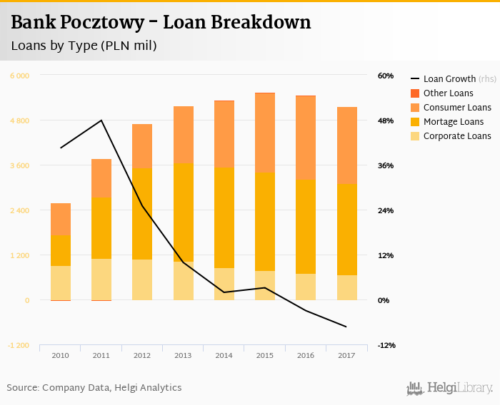 At the end of 2017, Bank Pocztowy's loans accounted for 78.2% of total deposits and 64.0% of total assets.
