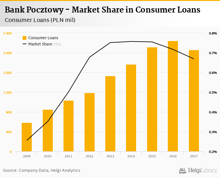 Bank Pocztowy's consumer loans reached PLN 2,056 mil in 2017, down 8.17% compared to the previous year.