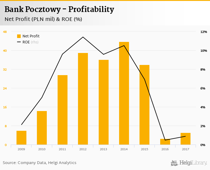 Comparing Bank Pocztowy with its closest peers, PKO BP generated a net profit of PLN 3,104 mil with ROE of 9.02% in 2017, Alior Bank netted PLN 515 mil (ROE of 7.97%) and Idea Bank announced a net profit of PLN 231 mil implying ROE of 8.89%.