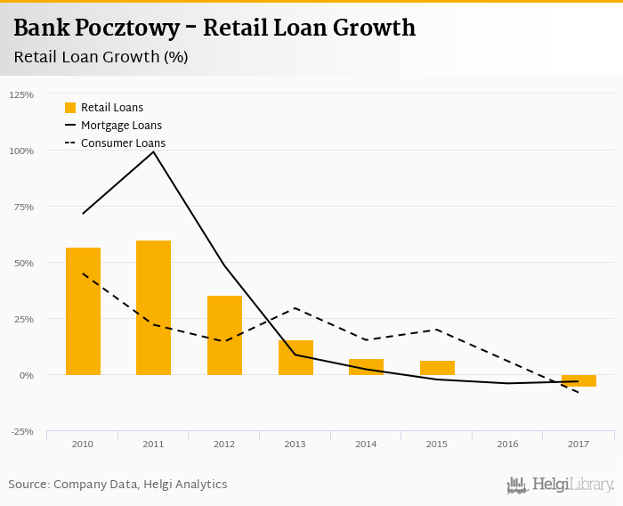 Bank Pocztowy's retail loans reached PLN 4,492 mil at the end of 2017, down 5.11% compared to the previous year. In the last decade, the average annual loan growth amounted to 0%.