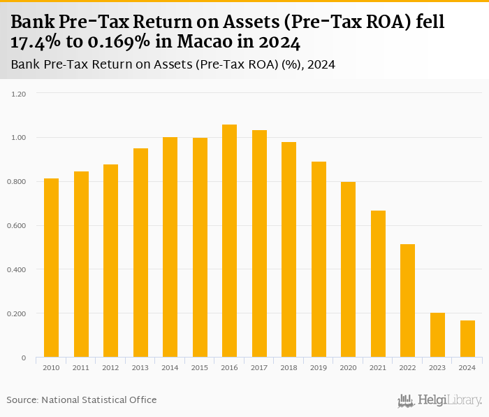 Historically, bank pre-tax ROA in Macao reached an all time high of 1.06% in 2016 and an all time low of 0.169% in 2024.