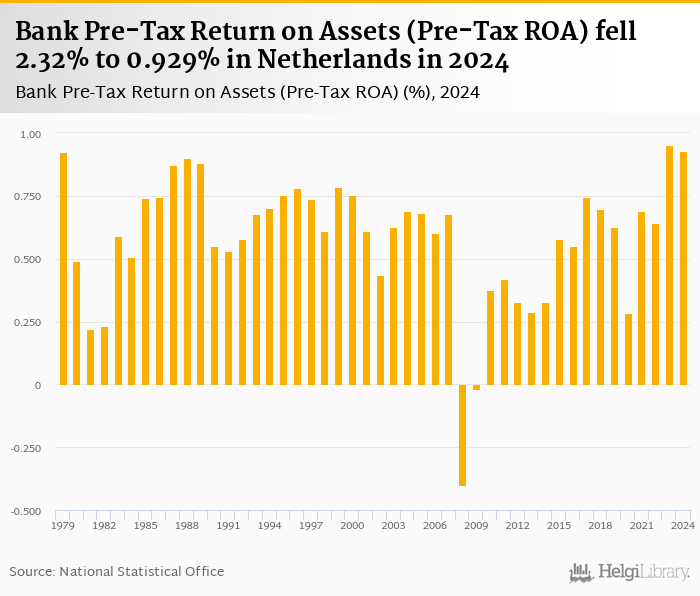 Bank pre-tax ROA fell 2.32% to 0.929% in Netherlands in 2024, according to the National Central Bank.
