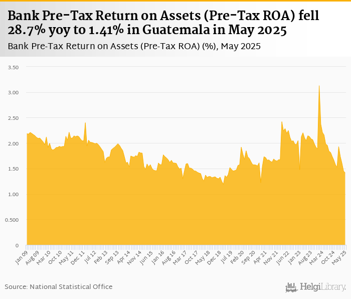 Bank pre-tax ROA fell 28.7% yoy to 1.41% in Guatemala in May 2025, according to the National Central Bank. This is 2.73% less than in the previous month.