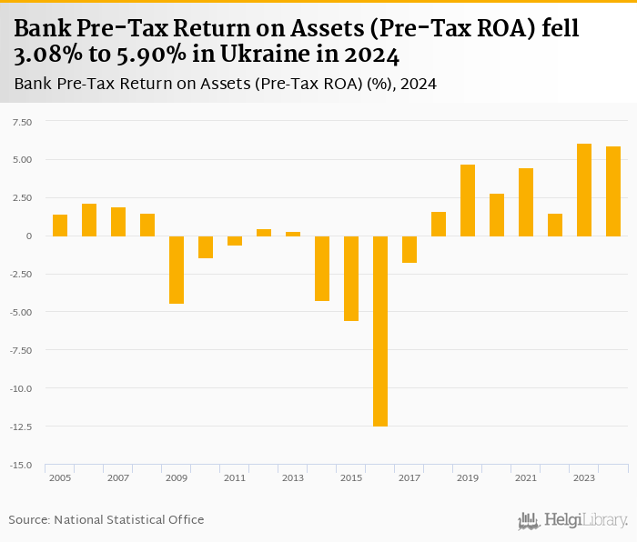 Bank pre-tax ROA fell 3.08% to 5.90% in Ukraine in 2024, according to the National Central Bank.