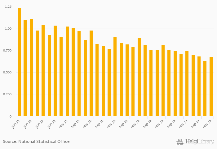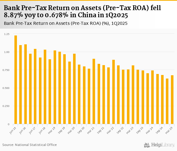 Bank pre-tax ROA fell 8.87% yoy to 0.678% in China in 1Q2025, according to the National Central Bank. This is 7.31% more than in the previous quarter.