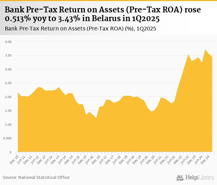 Bank pre-tax ROA rose 0.513% yoy to 3.43% in Belarus in 1Q2025, according to the National Central Bank. This is 3.02% less than in the previous quarter.