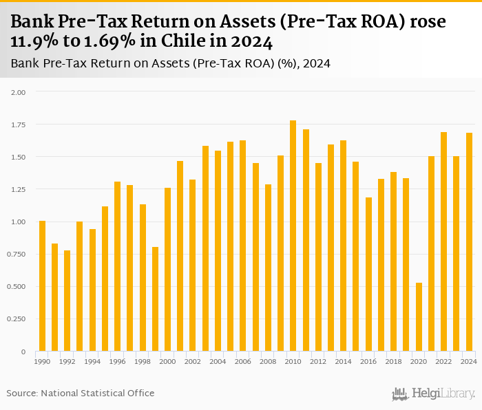 Bank pre-tax ROA rose 11.9% to 1.69% in Chile in 2024, according to the National Central Bank.