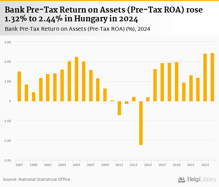 Bank pre-tax ROA rose 1.32% to 2.44% in Hungary in 2024, according to the National Central Bank.