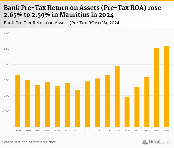 Bank pre-tax ROA rose 2.65% to 2.59% in Mauritius in 2024, according to the National Central Bank.