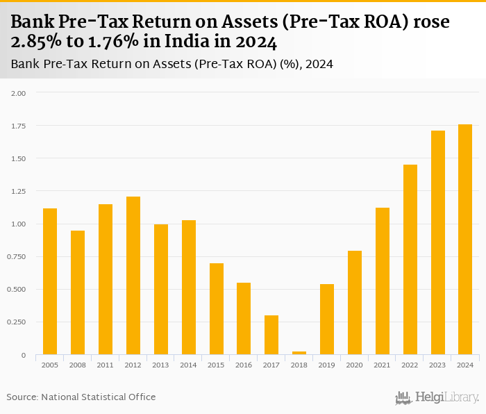 Historically, bank pre-tax ROA in India reached an all time high of 1.76% in 2024 and an all time low of 0.029% in 2018.