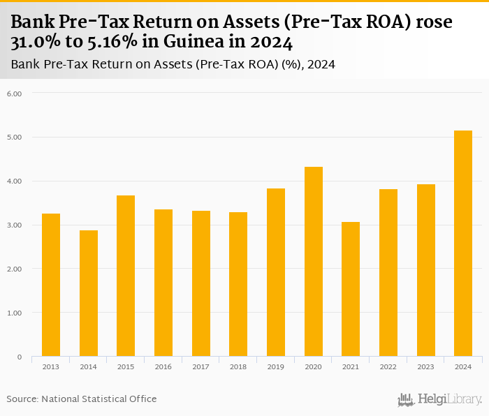 Bank pre-tax ROA rose 31.0% to 5.16% in Guinea in 2024, according to the National Central Bank.