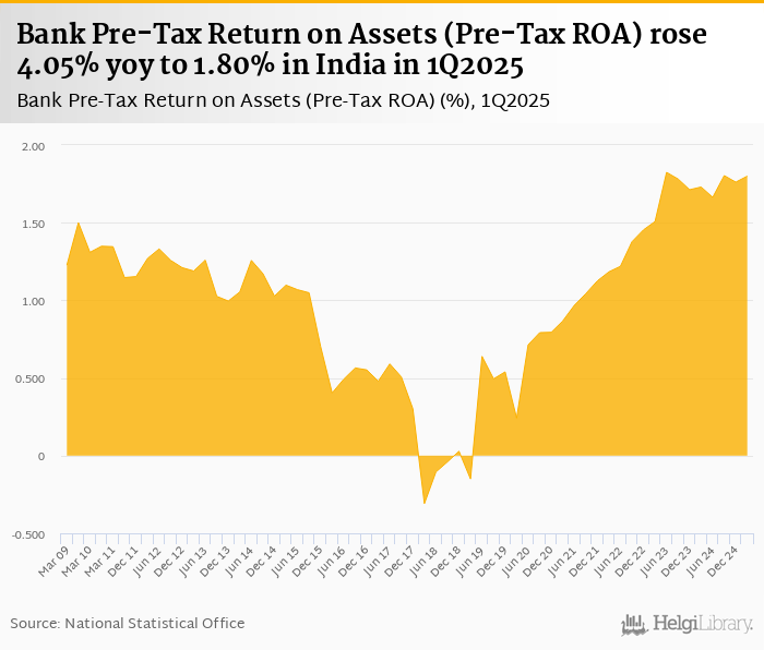 Bank pre-tax ROA rose 4.05% yoy to 1.80% in India in 1Q2025, according to the National Central Bank. This is 2.20% more than in the previous quarter.