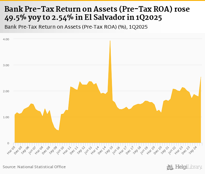 Bank pre-tax ROA rose 49.5% yoy to 2.54% in El Salvador in 1Q2025, according to the National Central Bank. This is 43.3% more than in the previous quarter.