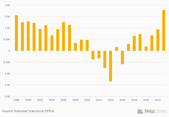 Historically, bank pre-tax ROA in Portugal reached an all time high of 1.78% in 2023 and an all time low of -1.35% in 2014.