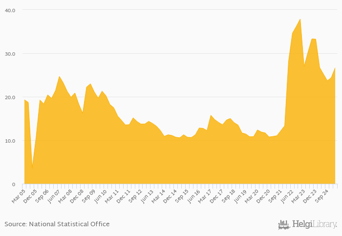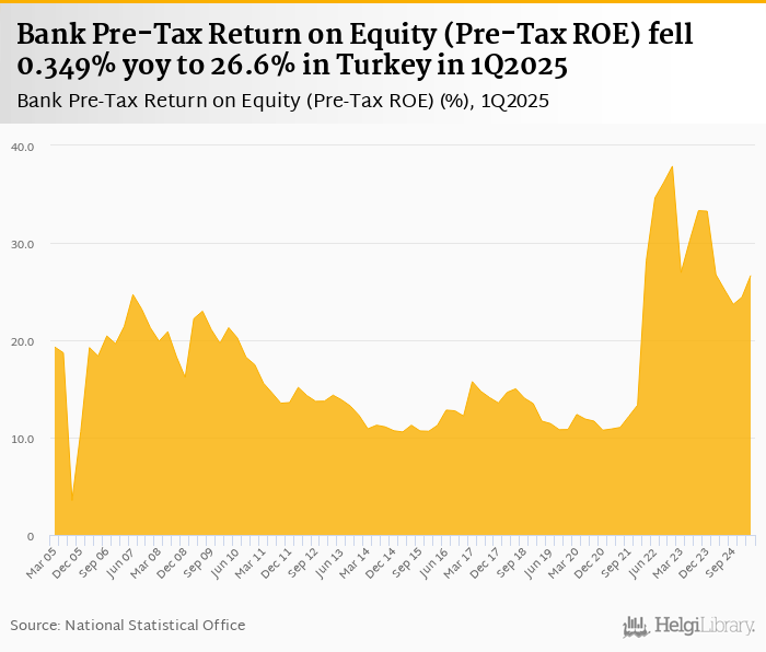 Bank pre-tax ROE fell 0.349% yoy to 26.6% in Turkey in 1Q2025, according to the National Central Bank. This is 9.13% more than in the previous quarter.