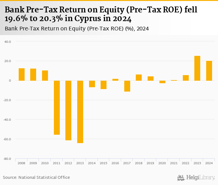 Historically, bank pre-tax ROE in Cyprus reached an all time high of 25.3% in 2023 and an all time low of -64.0% in 2013.