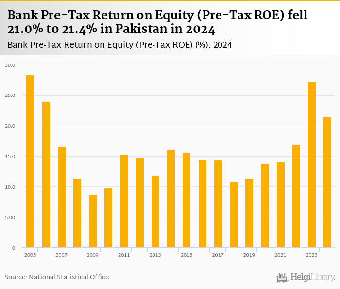 Bank pre-tax ROE fell 21.0% to 21.4% in Pakistan in 2024, according to the National Central Bank.