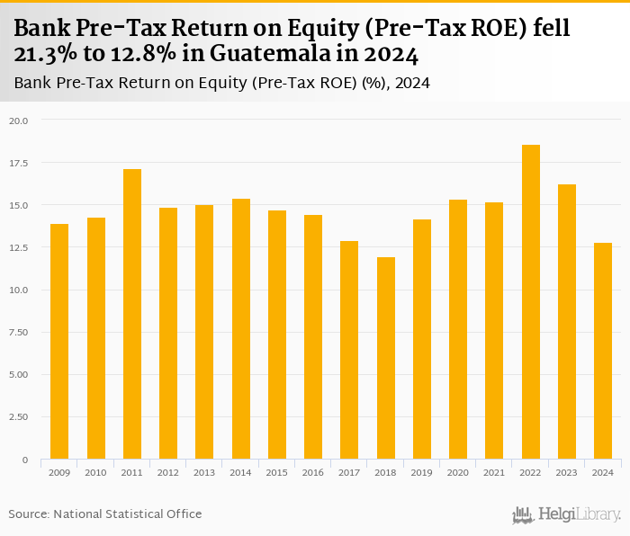 Historically, bank pre-tax ROE in Guatemala reached an all time high of 18.6% in 2022 and an all time low of 12.0% in 2018.