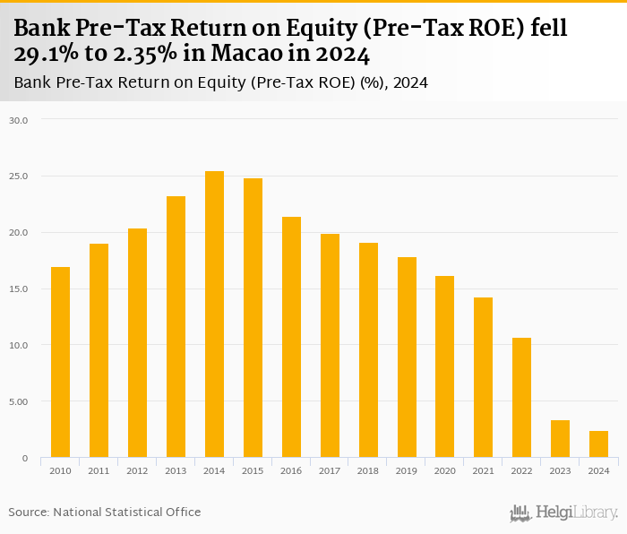 Historically, bank pre-tax ROE in Macao reached an all time high of 25.5% in 2014 and an all time low of 2.35% in 2024.
