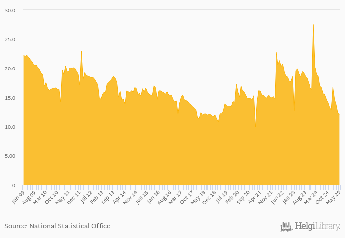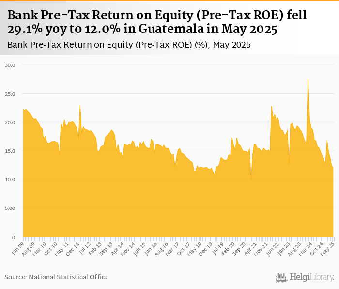 Bank pre-tax ROE fell 29.1% yoy to 12.0% in Guatemala in May 2025, according to the National Central Bank. This is 2.75% less than in the previous month.