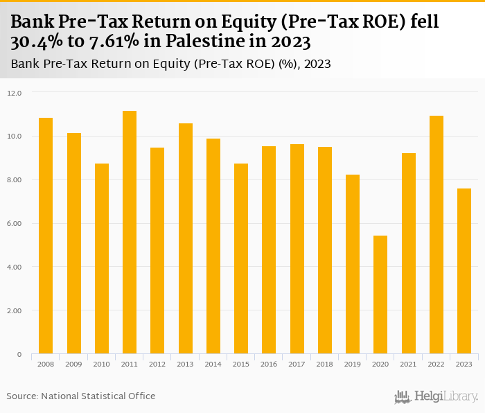 Historically, bank pre-tax ROE in Palestine reached an all time high of 11.2% in 2011 and an all time low of 5.44% in 2020.