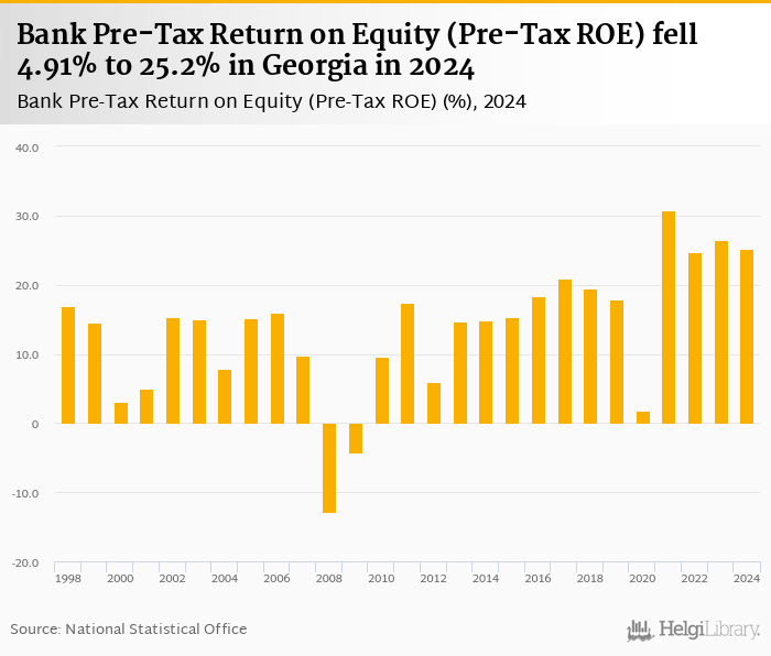 Bank pre-tax ROE fell 4.91% to 25.2% in Georgia in 2024, according to the National Central Bank.