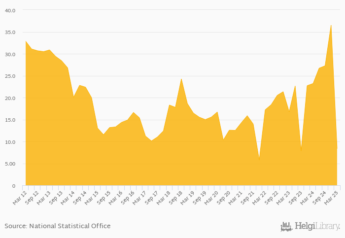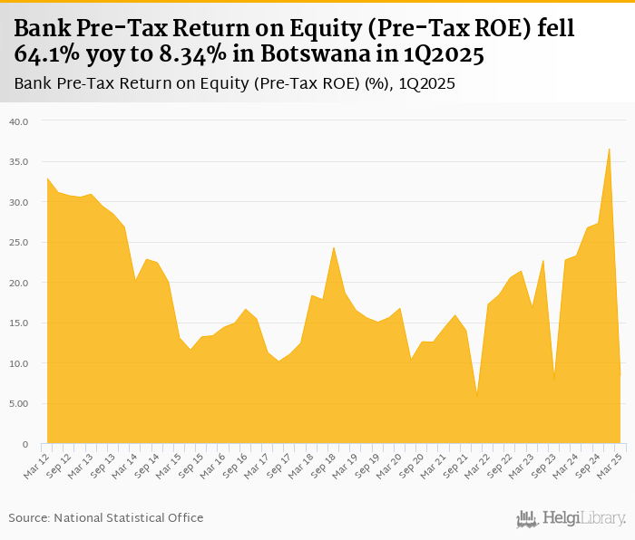 Bank pre-tax ROE fell 64.1% yoy to 8.34% in Botswana in 1Q2025, according to the National Central Bank. This is 77.2% less than in the previous quarter.