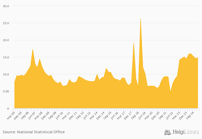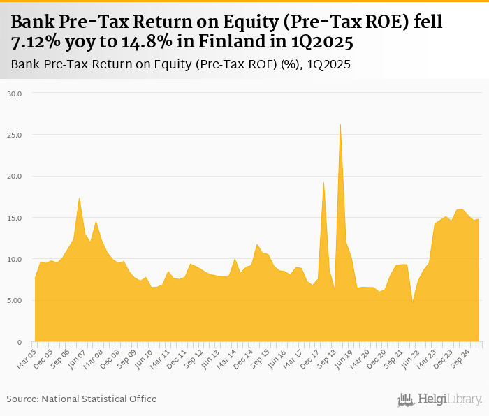 Bank pre-tax ROE fell 7.12% yoy to 14.8% in Finland in 1Q2025, according to the National Central Bank. This is 1.19% more than in the previous quarter.