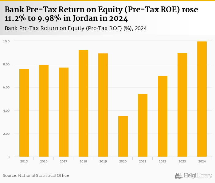 Bank pre-tax ROE rose 11.2% to 9.98% in Jordan in 2024, according to the National Central Bank.