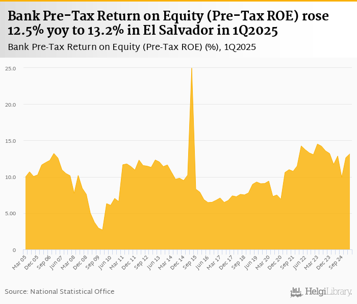 Bank pre-tax ROE rose 12.5% yoy to 13.2% in El Salvador in 1Q2025, according to the National Central Bank. This is 4.24% more than in the previous quarter.