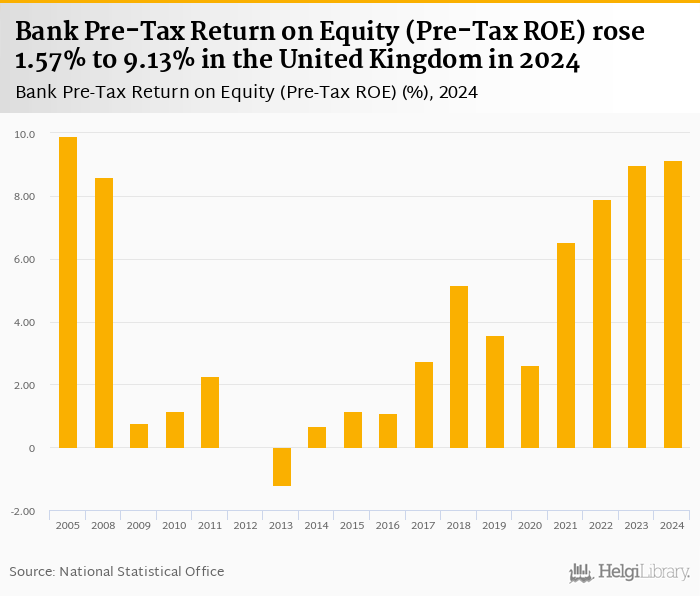 Historically, bank pre-tax ROE in the United Kingdom reached an all time high of 9.90% in 2005 and an all time low of -1.20% in 2013. When compared to United Kingdom's main peers, bank pre-tax ROE in Belgium amounted to 11.2%, 6.79% in France, 5.45% in Germany and 9.50% in Ireland in 2024.