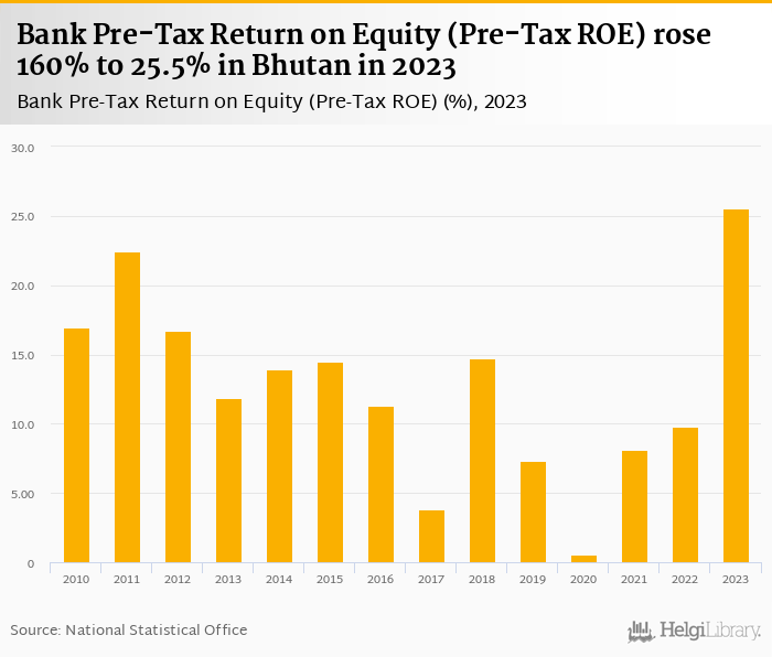 Bank pre-tax ROE rose 160% to 25.5% in Bhutan in 2023, according to the National Central Bank.