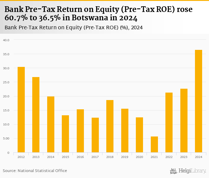 Historically, bank pre-tax ROE in Botswana reached an all time high of 36.5% in 2024 and an all time low of 5.76% in 2021.