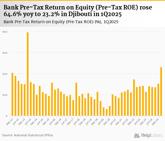Bank pre-tax ROE rose 64.6% yoy to 23.2% in Djibouti in 1Q2025, according to the National Central Bank. This is 51.3% more than in the previous quarter.
