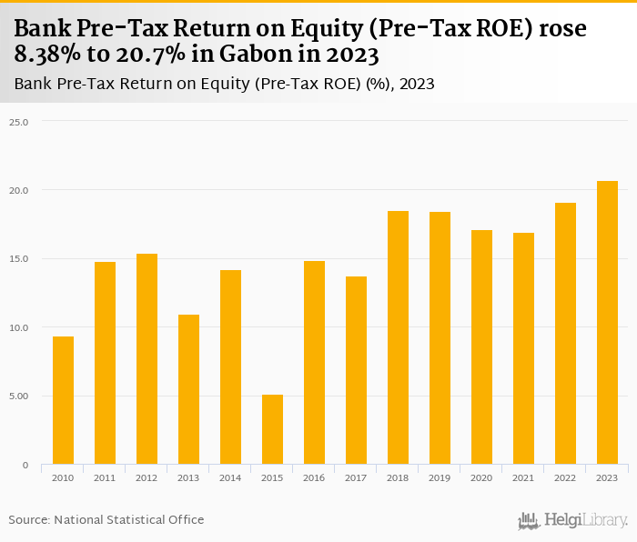 Historically, bank pre-tax ROE in Gabon reached an all time high of 20.7% in 2023 and an all time low of 5.13% in 2015.