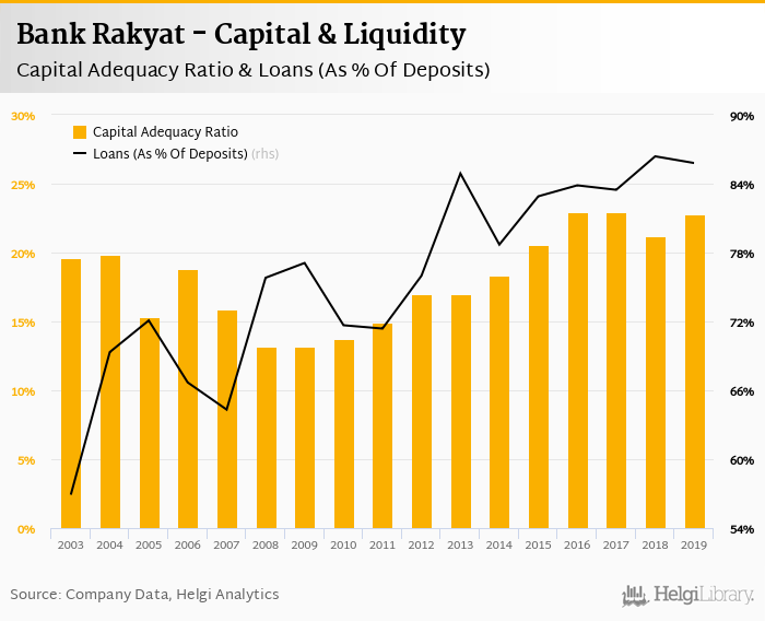 Bank Rakyat's capital adequacy ratio reached 22.8% at the end of 2019, up from 21.2% compared to the previous year. Historically, the bank’s capital ratio hit an all time high of 23.0% in 2017 and an all time low of 13.2% in 2008.