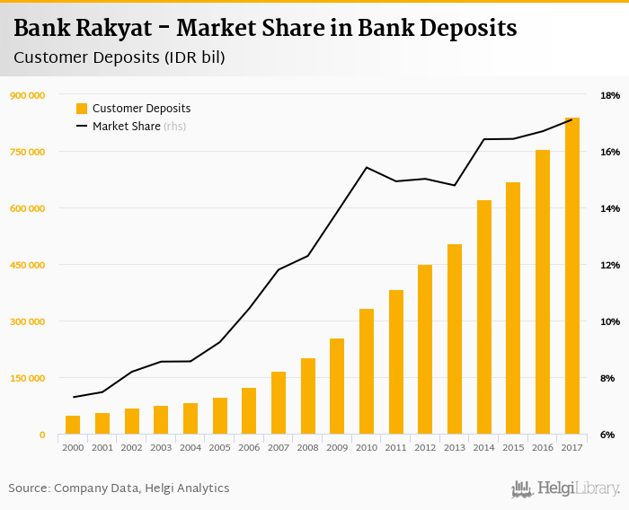 Bank Rakyat accounted for 17.1% of all customer deposits taken by banks in Indonesia at the end of 2017. Historically, the bank’s market share in customer deposits reached an all time high of 17.1% in 2017 and an all time low of 7.29% in 2000.