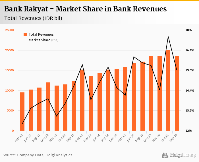 As a result, Bank Rakyat accounted for 15.6% of all bank revenues generated by banks in Indonesia in 2016-09-30. Historically, the bank’s market share in total revenues reached an all time high of 17.6% in 2016-06-30 and an all time low of 12.4% in 2012-03-31.