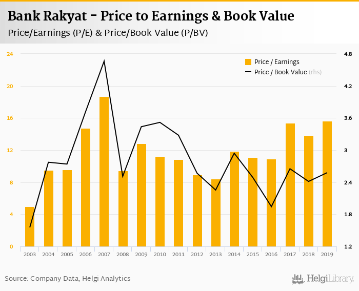 At the end of 2019, the bank traded at price to earnings of 15.7x. Within the last five years, the multiple reached an all time high of 15.7x in 2019 and an all time low of 10.9x in 2016 with an average of 13.4x.